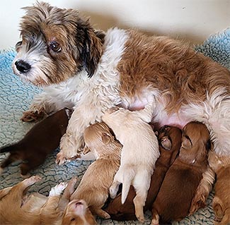 Super lækkert velskabt smukt kuld på hele 8 skønne hvalpe. Farverne er lyse gyldne toner samt nogle mere mårke brune nuencer. Clara klarede fødslen selvsikkert og uden problemer. Vi hjalp til, men hun kan godt selv. Clara elsker sine børn og nusser og plejer dem efter alle kunstens regler.